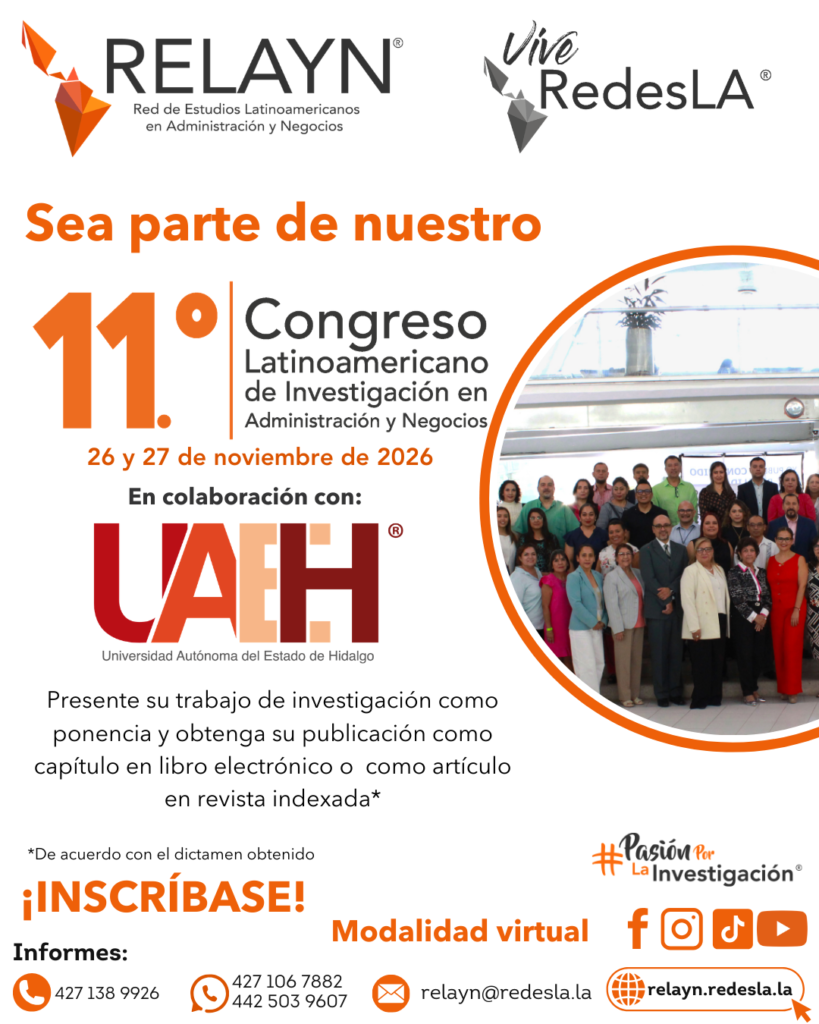 La Red de Estudios Latinoamericanos en Administración y Negocios (RELAYN) y La Escuela Superior Cd. Sahagun de la Universidad Autónoma del Estado de Hidalgo invitan a investigadores (as), académicos(as) y profesionistas del área Económico-Administrativa y áreas relacionadas que pertenezcan a alguna de las universidades públicas o privadas de Latinoamérica para contribuir y compartir ideas, estudios e investigaciones sobre la operación, gestión, entorno de la micro y pequeña empresa latinoamericana o temas relacionados durante el 11.º Congreso Latinoamericano de Investigación en Administración y Negocios. RELAYN 2026.